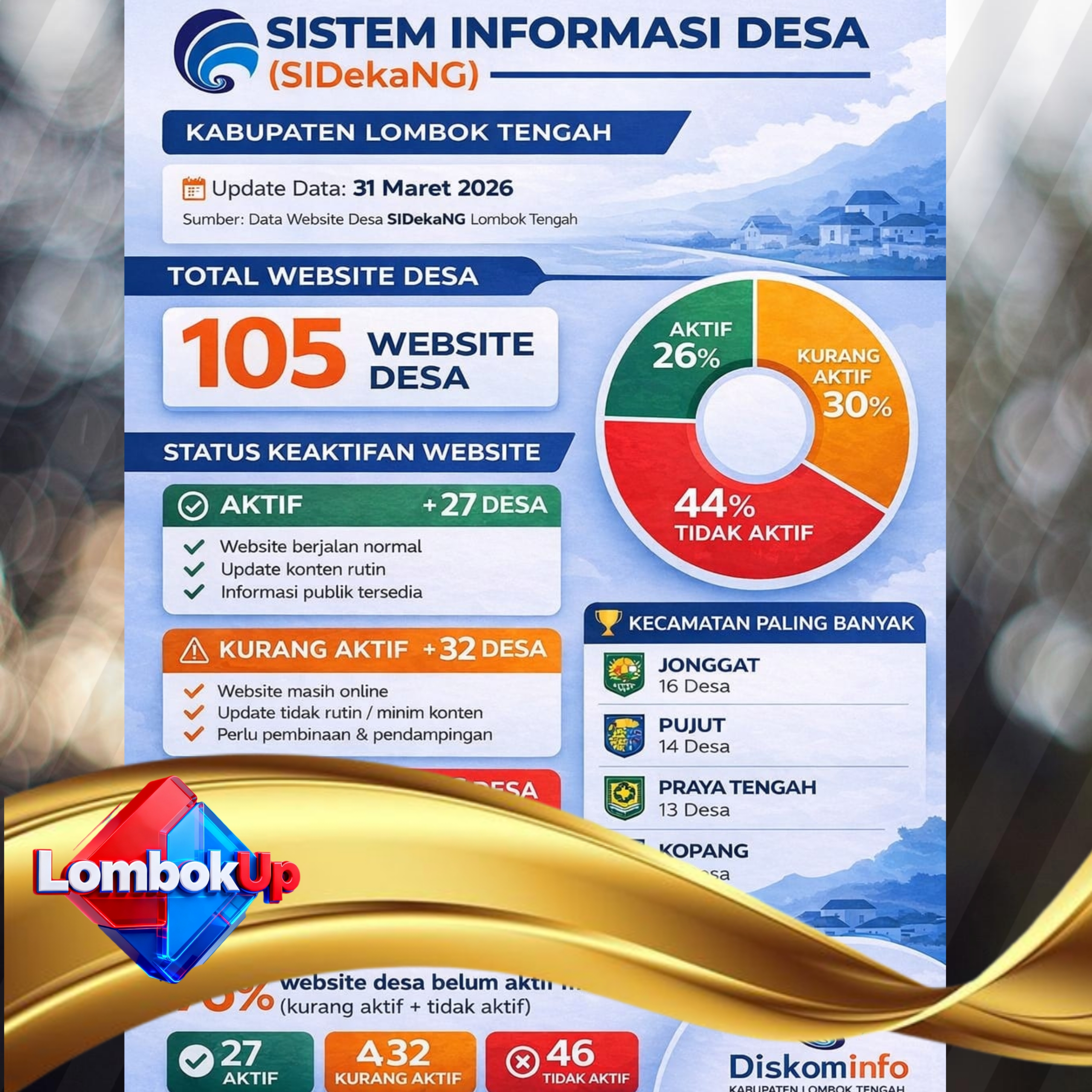Berdasarkan hasil monitoring, dari total 105 website desa di Kabupaten Lombok Tengah, hanya 27 desa yang masuk kategori aktif, 32 desa tergolong kurang aktif, dan 46 desa tidak aktif . Kondisi ini menunjukkan bahwa sebagian besar website desa belum dimanfaatkan secara optimal.